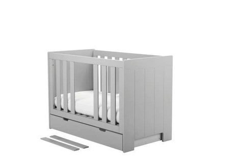 The crib is made of MDF board (sides with rungs, tops) and solid pine wood from Polish forests (frame). It has been painted with ecological water-based paints to ensure proper breathing and eliminate a factor that can cause allergies in children. The crib comes in white and gray colors.