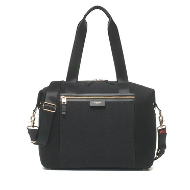 Defined by a neoprene silhouette with an embossed front panel, accented with soft leather trim and trendy metallic elements, the Stevie Luxe bag is perfectly proportioned and features adjustable side tabs that allow you to change the size and look in a snap. A wide opening that merges into a spacious interior with numerous compartments to store all your essentials. Includes a luxurious and extra-large changing mat with storage, a thermally insulated food and bottle pocket, and a long detachable strap with integrated patented straps for pram.
