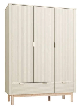 The aesthetics of the closet combine elegant fronts made of painted MDF, varnished solid beech wood legs and durable laminated particle board. Safety and durability are guaranteed by the use of approved paints that meet the EN 71-2 standard. In addition, in the production process, care for the health of users is confirmed by the use of boards with reduced formaldehyde content, complying with the EN16516 standard..