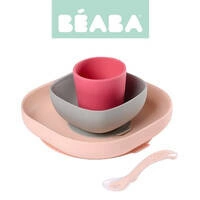 Set of dishes made of silicone from French brand BEABA consists of a plate, bowl, cup and training spoon.