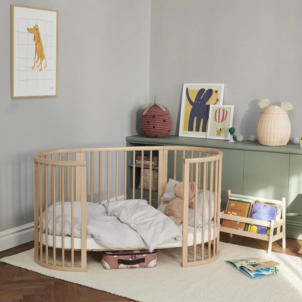 Sleepi™ Mini to początek historii – kompaktowe, owalne łóżeczko stworzone z myślą o noworodkach, idealne od chwili narodzin do około 6. miesiąca życia. Gdy dziecko zaczyna potrzebować więcej przestrzeni, wystarczy dodać Extension Set i większy materac, by łóżeczko przekształciło się w pełnowymiarowe Sleepi™ Bed (141 × 74 cm). Bez zmiany stylu. Bez utraty funkcji. Bez konieczności wymiany mebla. To przemyślana ewolucja, która pozwala jednemu projektowi pozostać z rodziną na dłużej – w niezmiennie pięknej formie.