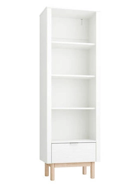 Elegancki regał otwarty dysponuje trzema przestronnymi półkami oraz funkcjonalną szufladą, wyposażoną w prowadnice wysokiej jakości z hamulcem i funkcją samodomyku. Jego konstrukcja łączy wyrafinowane połączenie malowanej płyty MDF, laminowanej płyty (tworzącej korpus oraz elementy wewnętrzne) oraz solidnych nóżek z litego drewna bukowego. Dla zapewnienia bezpieczeństwa i trwałości regał został pokryty atestowanymi farbami spełniającymi normę EN 71-2.