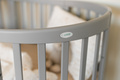 Wyposażone w gumowane kółka z hamulcem, łóżeczko można swobodnie przemieszczać po mieszkaniu bez rysowania podłóg. Dzięki owalnemu kształtowi, idealnie wpasowuje się w różne przestrzenie – od minimalistycznych sypialni po pokoje dziecięce w stylu boho, skandynawskim czy klasycznym.